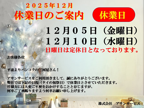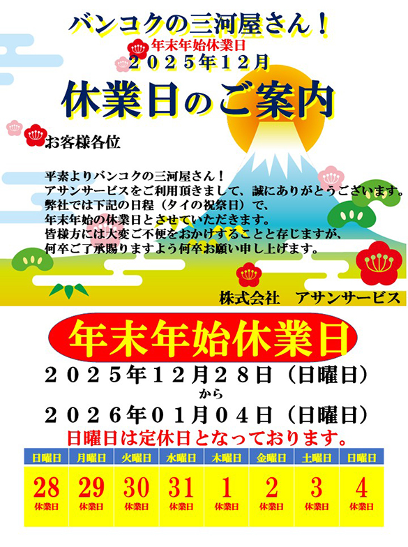 「バンコクの三河屋さん!アサンサービス」の営業日・休業日のお知らせは、弊社ホームページ右上にございます「営業カレンダー」にて、ご確認して下さいますよう何卒よろしくお願い申し上げます。